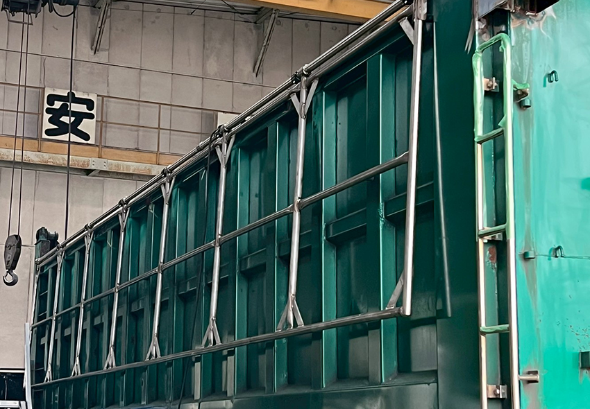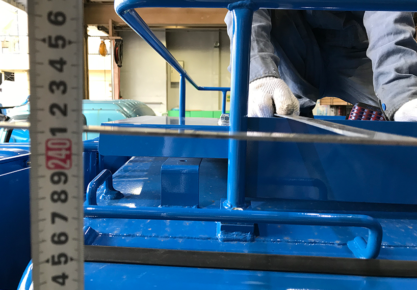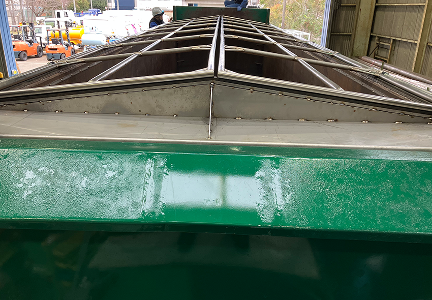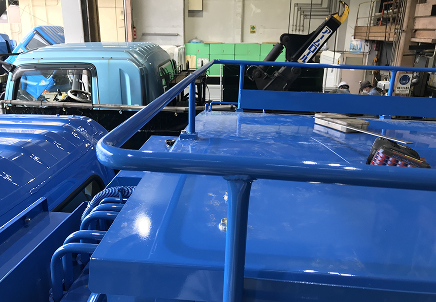 お客様は4t塵芥車、ご要望は車両の全高を可能な限り低くし、現状のルーフキャリアには前後に仕切り板がない為取り付けをしてほしいとの事でした。