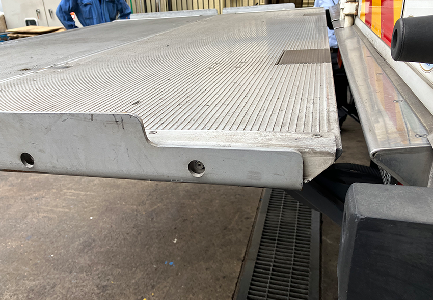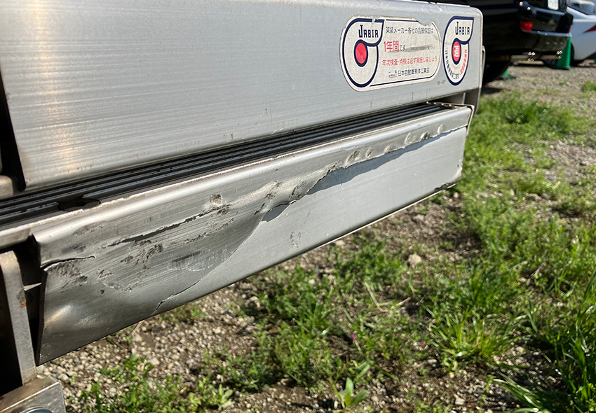 停車中に追突されたため100:0のお客様負担なしで保険会社が費用負担の案件になります。かくのうゲートは事故の衝撃で可動アーム部品が変形し荷台との高さや隙間が均一ではなくなっていました。リヤバンパも兼ねた重要保安部品であり変形した部品も多く、今後の動作保証も担保する為保険会社と相談、ゲートASSY交換で対応することになりました。