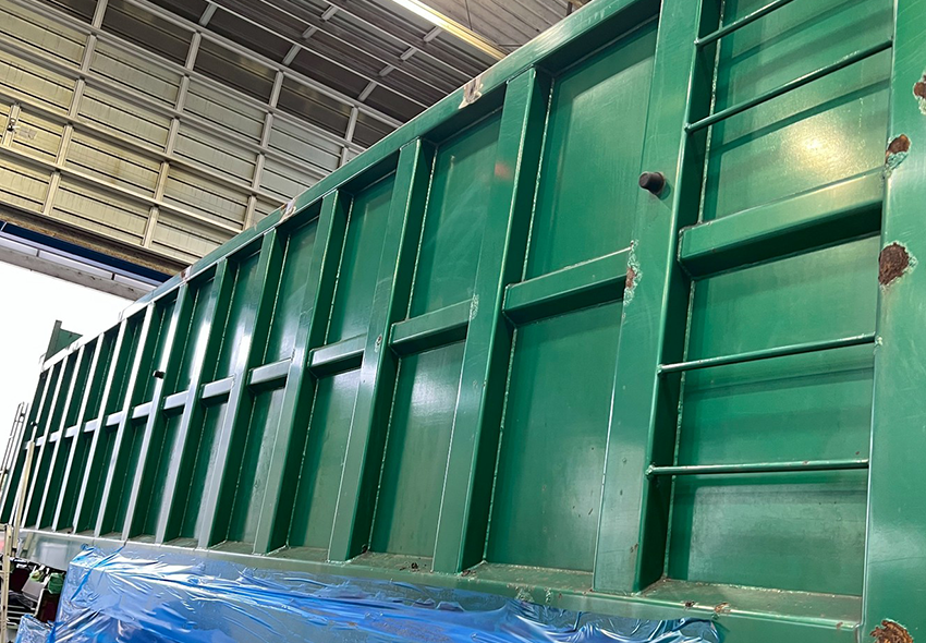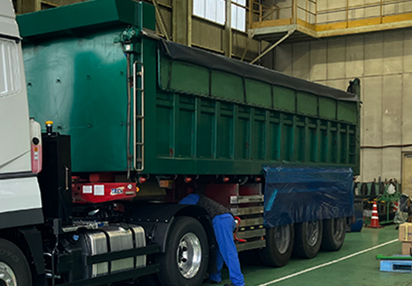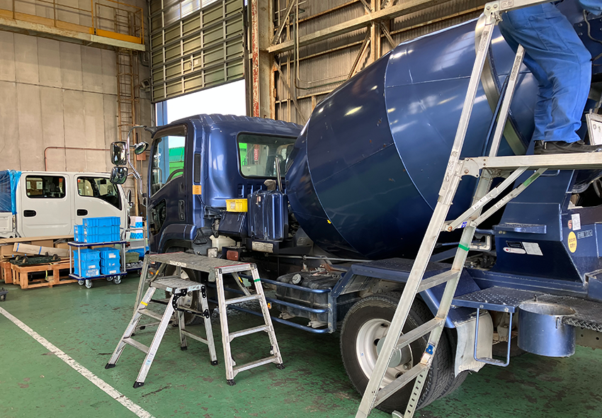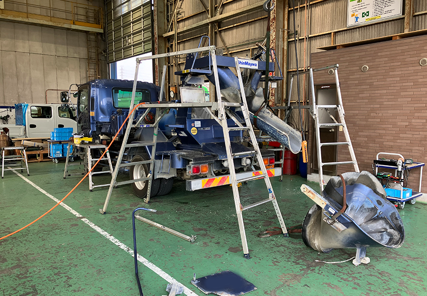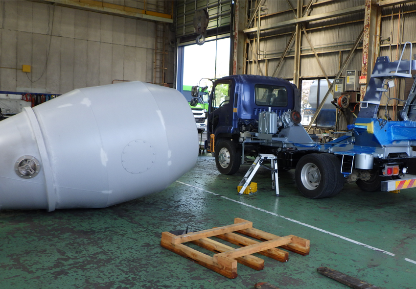 中型ミキサー車のドラム交換作業を行いました。ドラムは使用を続けると、生コンを攪拌する羽根形状の鉄板が摩耗し、排出性能が低下したり、ドラム本体の外板に穴が空いたりします。その場合は、ドラムのみを交換することが可能です。今回の作業では、ドラム交換と同時にフレームの錆落としおよび下塗り塗装を行い、その後、車両全体をお客様のご要望の色に塗装しました。油圧ホースや作動油も交換し新車同様に生まれ変わり、お客様にもご満足いただけました。